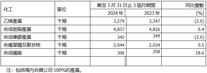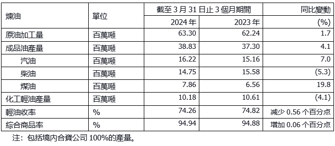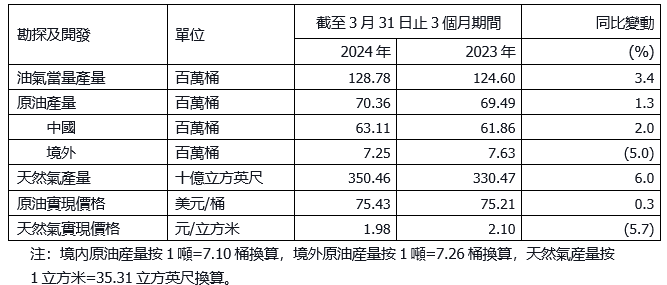 - 生產經營取得高質量成果。於一季度, 油氣當量產量128.78百萬桶,同比增長3.4%,其中天然氣產量3,504.6億立方英尺,同比增長6.0%。原油加工量6,330萬噸,同比增長1.7%。成品油總經銷量5,981萬噸,同比增長6.5%。乙烯產量327.9萬噸,化工產品經營總量1,951萬噸。