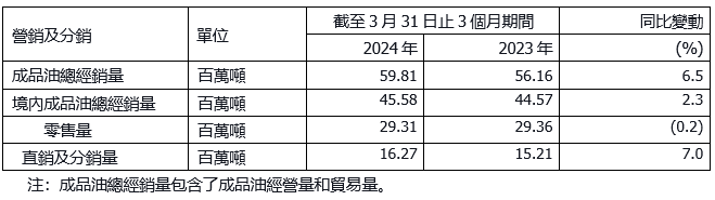 營銷及分銷:本公司充分發揮一體化優勢,加强市場研判和産銷協同,全力拓市擴銷創效。實施差异化策略,汽油經營量同比增長5.4%,車用LNG零售量同比增長119.3%;積極推動充換電業務發展,穩步推進氫能交通示範應用,向「油氣氫電服」綜合能源服務商轉型;開展特色營銷活動,非油業務經營質量和效益持續提升。一季度成品油總經銷量5,981萬噸,同比增長6.5%。營銷及分銷板塊息稅前利潤爲人民幣86.78億元。