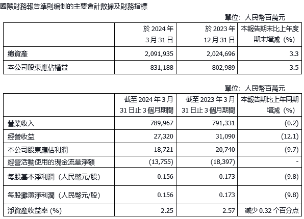 - 按國際財務報告準則,2024年第一季度本公司實現營業收入為人民幣7,899.67億元;歸屬於本公司股東淨利潤為人民幣187.21億元;基本每股收益為人民幣0.156元。按中國企業會計準則,第一季度歸屬於母公司股東淨利潤為人民幣183.16億元;基本每股收益為人民幣0.153元。